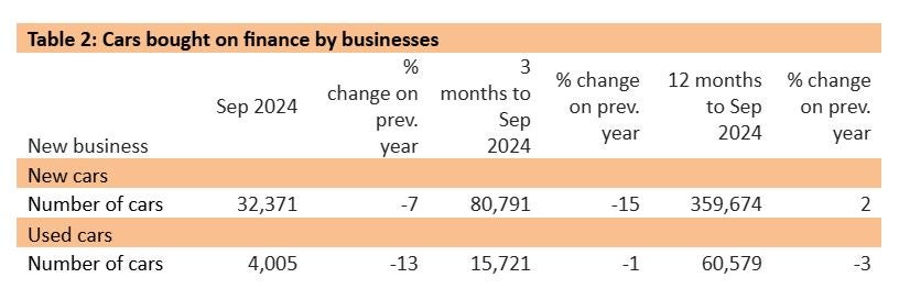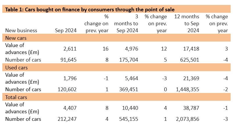 The consumer new car finance market reported new business by value in September 16% higher than in the same month in 2023, while new business volumes grew by 8%. In the nine months to September 2024, new business volumes in this market were 3% lower than in the same period in 2023.