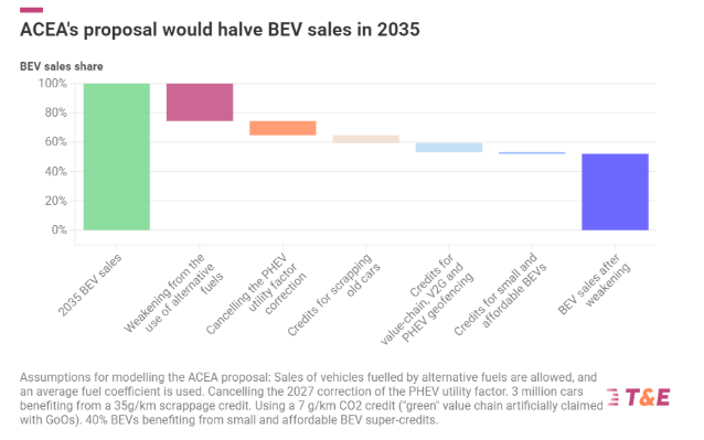 According to T&E, ACEA’s proposals would have a cumulative impact that effectively lowers the required market share of electric vehicles (EVs) to 52% in 2035. The group’s analysis suggests that counting cars using e-fuels or biofuels as zero-emission could reduce EV sales by around a quarter.